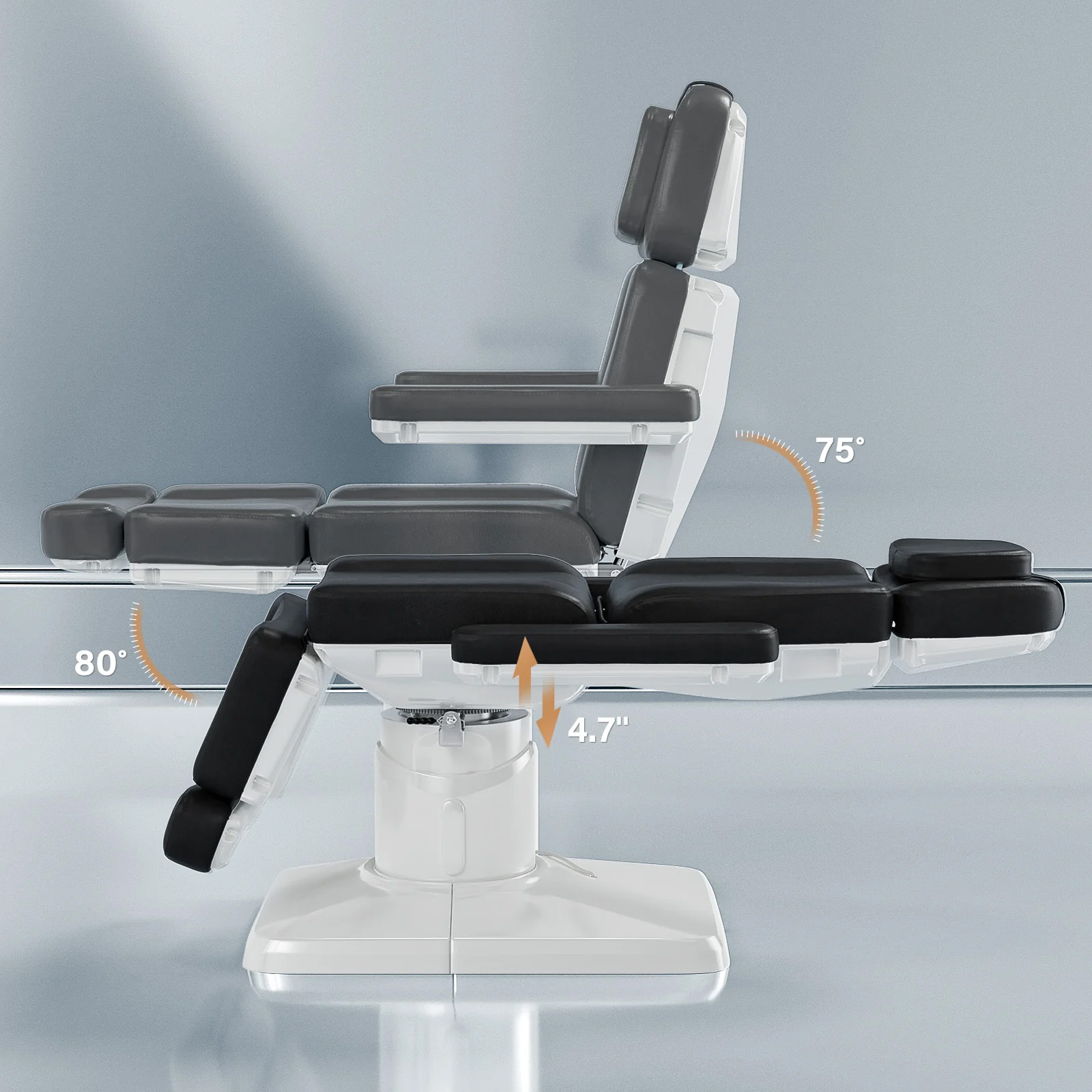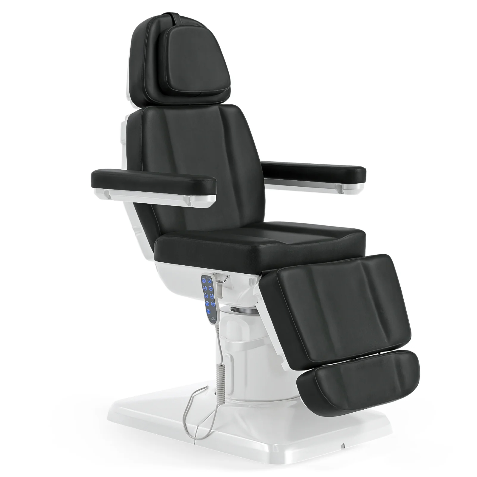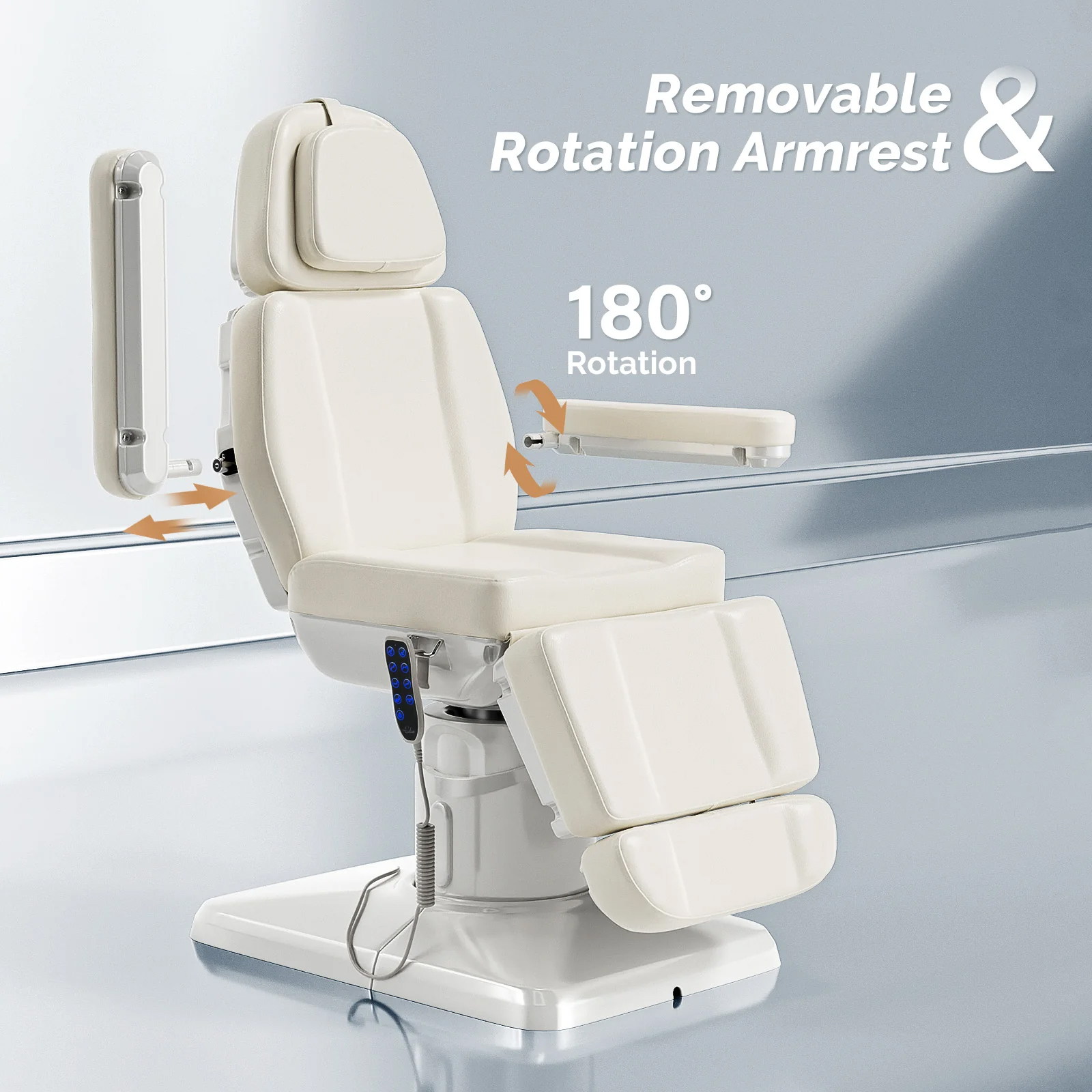 - Includes removable armrests that rotate 180°, ensuring easy access and flexibility during treatments.